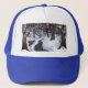 Forest stream and trees in a winter snow storm trucker hat
