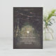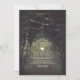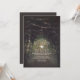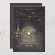 Rustic wedding invitation with enchanted nature design: old trees forest and string lights path. Vintage invite for your outdoor wedding in the woods.