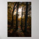 A beautiful photograph with an autumn sun in the forest. The sun shines through yellow leaves into the dark forest, creating long shadows on the ground, and a little blue lens flare. Add text or customise if you want to.