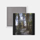 A snow covered branch creates an arch, with ferns hanging from its moss covered bark, across a tree lined path towards the summit of this hill in the woods of Rainier Oregon. Beyond the forest the sky shines crystal blue in the early morning light.