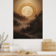 Nighttime landscape of a forest shrouded in mystery, illuminated by the moonlight. Warm tones and deep shadows create a magical and contemplative atmosphere.