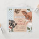 Cute forest animals racoon owl and fox with glasses. The text is on a pink background, with grey dots and rose leaves on the side. The invitation is unisex