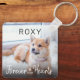 A simple pet photo memorial keychain, featuring your dog or cats name, your most favourite photograph and the text 'Forever in our Hearts' with a cute little pawprint. Overlays have been added to help the text be more readable.