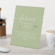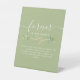Elegant, simple gold and green wedding memorial table pedestal sign with eucalyptus greenery, rope heart and modern calligraphy script.