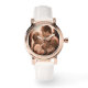 This beautiful watch has a pink gold face / frame and white band. Add your special photo and personalise with handwritten, script text along the bottom. Sample wording is, "Our love is forever", or change it. This feminine watch makes a lovely gift for a wife or girlfriend. Your photo will have a pinkish tinge because of the filter chosen. To change that, use the design tool. Choose the photo, on the design tool page, and then "filters". Change it to no filter. This is one of many wristwatch styles. The design is easy to swap to any other style.