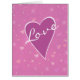 A stylised rose pink heart bordered in white says "Love" in white across it on the front of this sweetheart valentine card. The heart image and text are placed on a pretty pink and violet heart and stars confetti background. The text on the inside and outside is customisable. You may change it to your own special message, or leave as is.