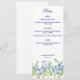 A wedding menu card featuring forget me now flowers.