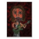 A digital image of a burnt out rock star created from a pencil sketch. The musician is playing a green guitar and has brown hair and pinkish skin. The cartoon character has big lips and dark circles around his eyes. The background is a burnt dark red with swirls of black and a subtle zoom effect.