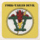 Colorful P-38 Squadron cartoon logo with fork-tailed devil in black stencil font. "The P-38 Lightning was known by the German Luftwaffe pilots as the ""Fork-Tailed Devil"" due to its unique design. Many of the fighter squadrons during WWII had their own unique insignia, often designed by the men in their squads. This design was used by the 49th Fighter Squadron in Foggia, Italy.