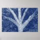 A photo of a tree with fanned out forked branches with a cyanotype effect.