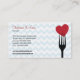 Work put into a restaurant or catering business comes from the heart. A fork spears a heart on this business card to show all the love put into your culinary creations. The pale blue chevron pattern is subtle with a website or any other information standing out in a light blue panel at the bottom. The reverse repeats the fork/heart image to offset business information. Available in alternate colours with matching products.