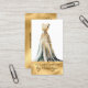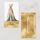 Elegant wedding dress seamstress business card, with watercolor artwork of a fancy long gown, against a white and gold background. Personalise the text to suit your business needs. A lovely stand out card for your tailoring business.