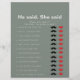 This formal green he said she said bridal shower game is perfect for a classic bridal shower. The design features a beautiful font in a green background to embellish your event.