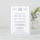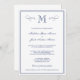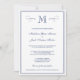 An elegant, formal monogram dark blue & white wedding invitation with a pretty flourish design.
