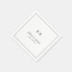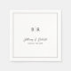 Chic white wedding table napkins featuring a simple black border, your initials, names in a elegant script font, and your wedding date.