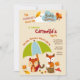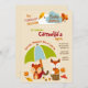 A woodland-theme baby shower invitation with a squirrel, fox, fall leaves, acorns and mushroom under an umbrella. The top border features rain clouds and raindrops.(<a href='https://www.freepik.com/free-vector/lovely-autumn-characters-and-elements_805200.htm'>Designed by Freepik</a>). <br/><br/>The card is easy to customise with your wording, font, font colour, paper shape options and choice of six paper types.<br/><br/>Not exactly what you're looking for? All our products can be custom designed to meet your needs at no extra charge.<br/><br/>Simply contact us at heartfelthelper@gmail.com.<br/><br/>Coordinating products available: Just ask us!