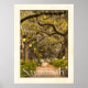 A travel photograph of Forsyth Park in Savannah, Georgia showing a canopy of Oak tree limbs covered with Spanish over a dirt path and street light lights glowing. This photo was digitally enhanced to give it a painterly look. Framed by a graphic design off textured off-white paper.