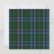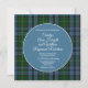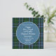 Stylish square Scottish highland wedding invitation done in the traditional blue, green, maroon and black clan Forsyth tartan plaid pattern. A blue round text area has white custom text ready to personalise. Matching products are available.