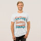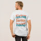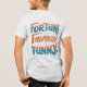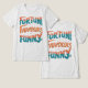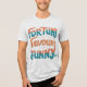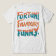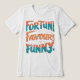 The t-shirt design features the phrase "Fortune Favours Funny" in bold, multi-coloured lettering. The text is arranged in a playful and vibrant style, with each word using a different font and colour for a visually striking effect. The design is ideal for those who appreciate humour and believe that a positive attitude can lead to good fortune.