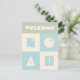 Four letter baby name congratulation card for a newborn baby and its parents in neutral pastel light blue green beige colours. The 4 letters are customisable adjusting to the kids name. The letters are chosen in a cute font so that it looks childishly figurative.
