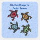 This square sticker bookplate label is blue with four black turtles with abstract designs on their shells in multiple colours of red, blue, yellow, and green. Customise your text with the templates.