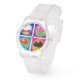 A super cute watch featuring four adorable, colourful cupcakes decorated with rainbows, flowers, hearts, butterflies, unicorns and more, each with bright backgrounds. It is perfect gift for a girl. The art is from the hugely popular game "My Cupcake Bakery".