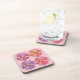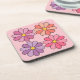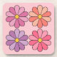 This coaster features four stylised daisies on a light pink background. Each flower has 10 petals arranged in a circular pattern with outlines. The flowers look cute and cheery on the pink background. The coaster is a hard plastic coaster with a cork back. The set contains six coasters.