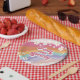Four Ever Groovy Retro Rainbow 4th birthday plates with daisies.