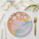 Four Ever Groovy Retro Rainbow 4th birthday plates with daisies.