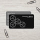 A business/profile card template with a stylish four gear wheel motif on the front. Company name and business type on the front top right. Name and all other contact on the reverse with a single gear motif in the bottom right. Ready to be customised with your details, suitable for many types of business.
