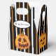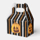 This fun Halloween Favour Box features four Jack-O-Lanterns, on a background of black, orange and white stripes. You can customise this favour box by adding text to the front panel.