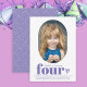 An adorable birthday party invitation for a child turning 4, this simple modern design in a with purple text puts the emphasis on your beautiful child as they prepare to celebrate at their fourth birthday party. The unique oval frame has a photo template to personalise with your child's vertical photo. Personalise the text template with your child's name and the party details. The back of the card has a cute geometric pattern which coordinates the colour scheme. This invitation may be ordered in both printed and paperless digital download formats for your convenience.