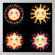 Four sun faces in brilliant yellow blue red and orange on a black blackground in this poster.