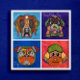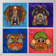 Four unique ugly dog faces with bold, colourful abstract patterns: Pug, Bernese Mountain Dog, Labrador, Poodle. Popular with dog lovers and pet lovers and rescue dog lovers.