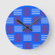 This clock has a mid-century modern design that looks like a weave with red and white lines on a field of blue.