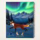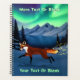 A red fox (Vulpes vulpes) running through a snowy, winter night with the Northern Lights aglow over distant mountains; sparks emanate from the fox's tail. Customise this product by adding your own text.