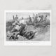 This engraving was a two page spread in the "Graphic Illustrated" for 1890. Entitled " 'Ware wire" it shows two unfortunate horses falling and throwing their riders after catching the wire hidden behind a hedge. Other riders have stopped in alarm on the other side of the hedge, including a lady riding sidesaddle. This is a beautifully drawn and engraved scene of foxhunting in England in Victorian times, though the subject matter is an unhappy accident. Drawn by John Charlton and published in 1890.