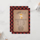 A birthday party invitation featuring an illustration of a baby fox. Personalise the text. Background is red and black lumberjack plaid inspired buffalo plaid pattern.