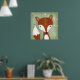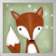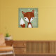 A digital painting of a whimsical fox is seen against the green wood-grained background. Little white flowers are seen on vines hanging in the right hand corner. Beautiful painting in soft colours is perfect for any woodland themed area, whether it be a baby nursery, daycare facility, or play room.