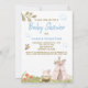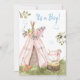 * Woodland Forest Fox TRIBAL BOHO BABY BOY SHOWER invitation. A Teepee decorated with flowers is set neary by the FOX who is enjoying the day on a tree stump surrounded by green grass as greenery and foliage.
