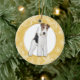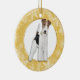 A gold border with ornate white snowflakes makes a pretty frame for an image of a brown, black and white Fox Terrier dog on the front of this ornament. The back has the same snowflake frame with a pale interior that holds your custom text.