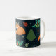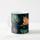 Seamless pattern with Foxes, trees, leaves, mushrooms and berries on dark background.
