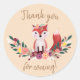 Watercolour fox sitting on a floral border with flowers on the head round thank you sticker. Dusty Grey background with dark gold letters and decorative handwritten font.
