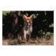 A cute young fox appears to be smiling from its shadowy hiding place.