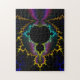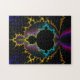 A fractal art design with glowing edged Mandelbrot shapes. Colours include purple, blue, yellow and aqua on black.