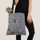 A custom all-over-print tote bag that features a black and white artistic fractal cat background on both sides of the bag.