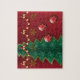 Layers of fractals make up this stylised Christmas design. A muted red backdrop, a spiky green tree, gold stars and snowflakes hanging from a strand of red and gold beads, and three red balls with a twirling gold design hanging in front.