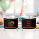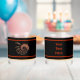 A multi-coloured (red, yellow and orange), spiralling fractal image, resembling a bird or feathered dragon, on a dark background. Customise by adding your own text on the reverse side. You may change both the text colour and font.