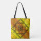 Three styles of hand-drawn fractals, including Sierpinski triangles, Apollonian gaskets, and a similarly themed square design, make up the layers of this geometric mandala, overlaid onto a bright yellow and orange gradient. This bag is available in multiple sizes and both tote bag and cross body bag styles.