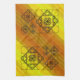Three styles of hand-drawn fractals, including Siepinski triangles, Apollonian gaskets, and a similarly themed square design, make up the layers of this geometric mandala, overlaid onto a bright yellow and orange gradient.
